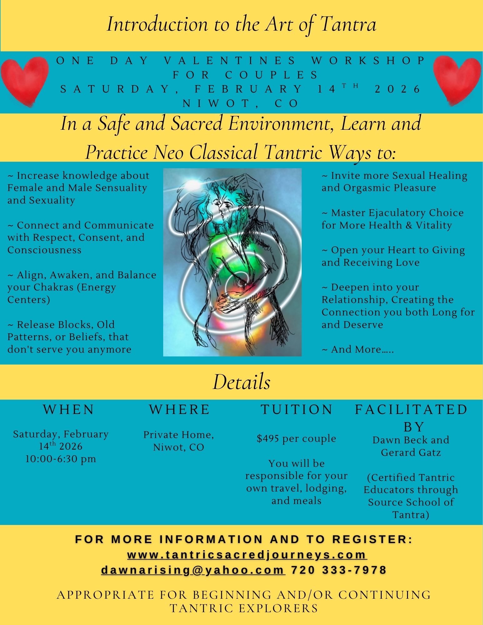 This weekend will dip back into, and build on the prior Beginners Weekend that you have either experienced with us, or build on your prior Tantric experience/education. If you haven’t had any prior Tantric experience/education, we are happy to have a conversation about scheduling some Virtual (or In Person, if local in Colorado) Private Sessions with us, to prepare.
